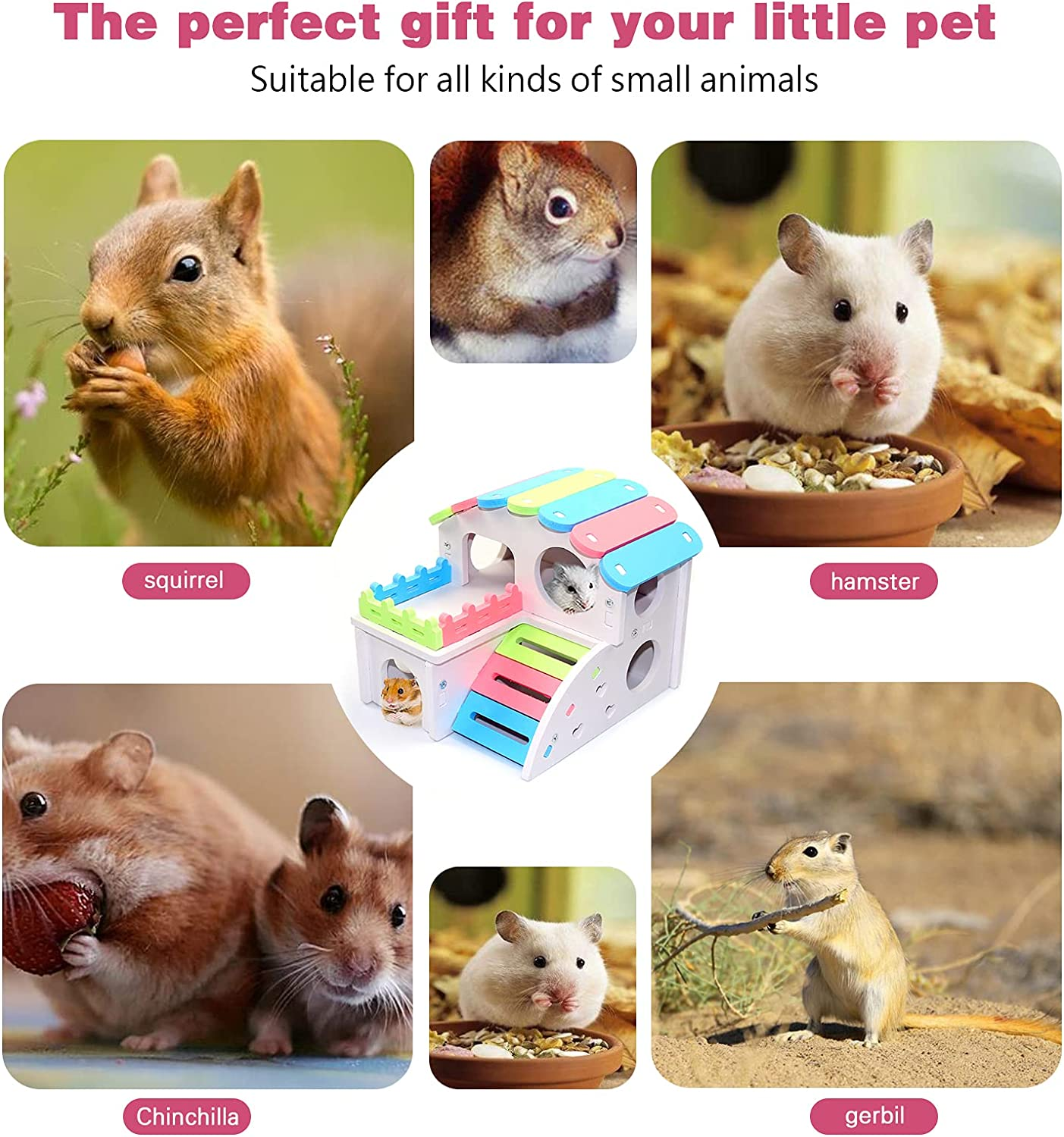 This hamster toy contains a DIY hawaii villa-style double layer rainbow hamster house, a triangle swing, a seesaw, a hanging chain swing to help you design a playground for your pet to exercise and play on. Provides small animals with a hideout, promotes nesting instincts.