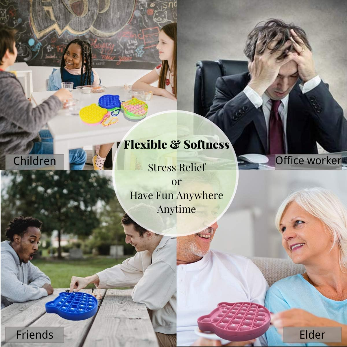When you press down the bubble, it will make a slight popping sound. A crisp voice can give you the greatest comfort. And you can effectively relieve stress and anxiety, and pass boring time as long as you play and squeeze with these restless devices.