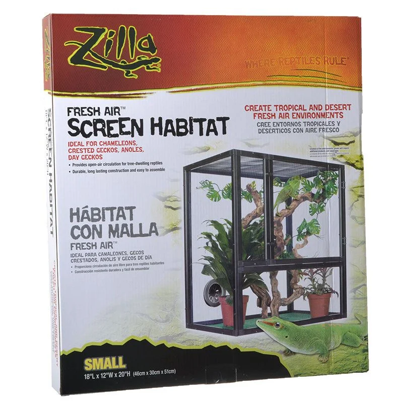 Zilla Fresh Air Screen Habitat for Reptiles SMALL – 18″ x 12″ x 20 ” The Zilla Fresh Air Screen Habitat is perfect for making your reptile feel at home! This durable screen cage provides open-air circulation to replicate the natural environment of tree-dwelling reptiles. Perfect for creating tropical and desert fresh air habitats! Easy to assemble and ideal for a wide variety of small reptiles.