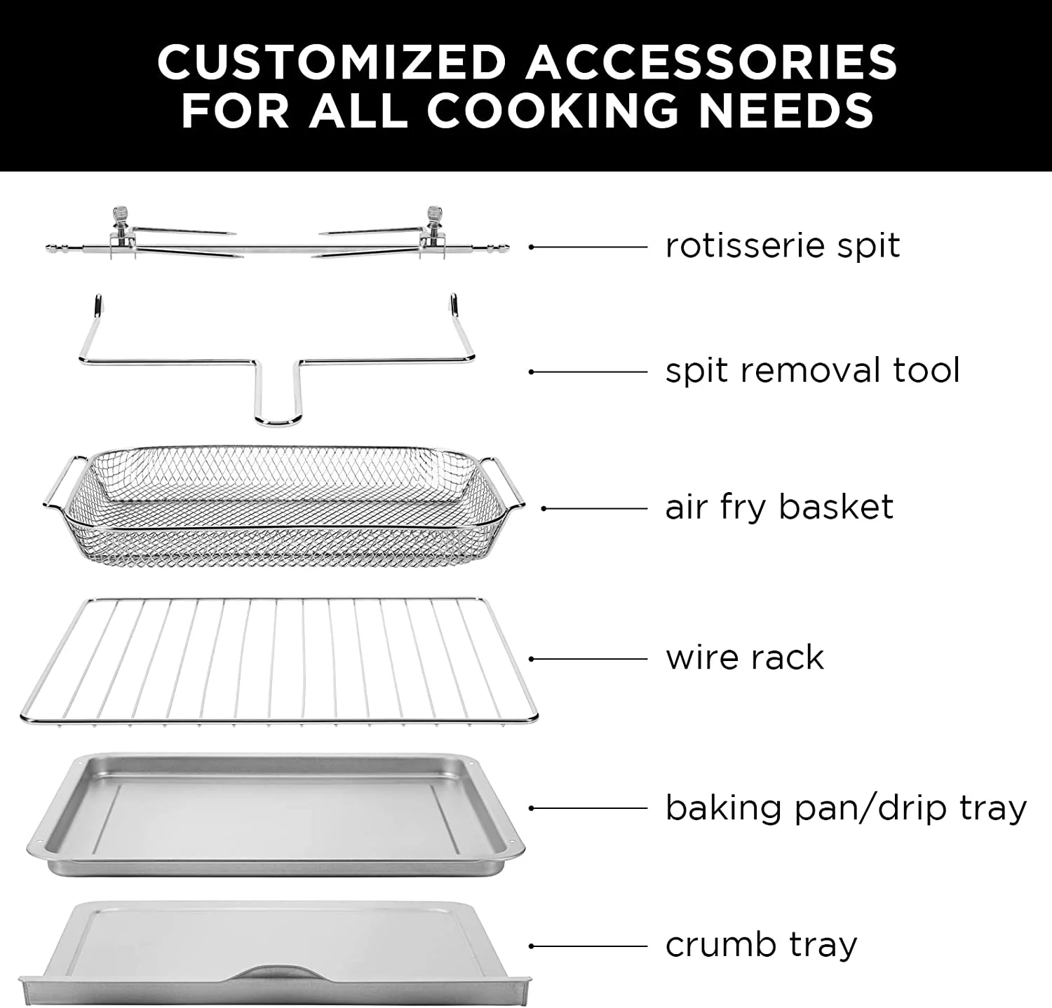 - ACCESSORIES FOR EVERY TASK: You can now take on any cooking task with absolute confidence. Air fry tasty chicken tenders in the included basket, cook a whole chicken on the rotisserie spit, bake your world-famous banana bread on the pan, or whip up french fries to a golden finish on the wire rack.